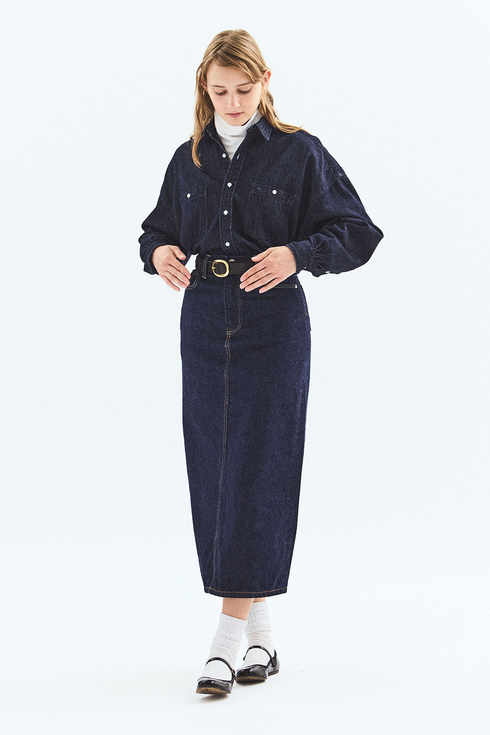 9オンスのインディゴデニムを使用したシャツに、12オンスのマキシスカートのクリーンなセットアップスタイル。